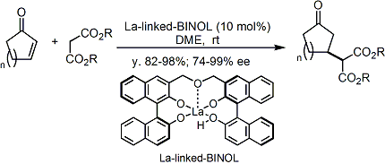 Shibasaki’s La-linked-BINOL complex is a highly active asymmetric Michael addition catalyst, which is also stable enough to be stored in open air without loss of activity.[2]