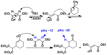 The activated proton of malonate ester is easily deprotonated. The enolate of the Michael adduct is strongly basic, thus deprotonates another malonate. Since this process is almost irreversible, the ratio of the nucleophile to the electrophile can be 1:1 to obtain high yield unlike aldol reactions. The base can be used in substoichiometric amounts.
