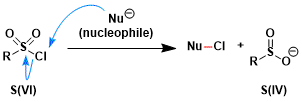 The nucleophilic addition-elimination reactions at S(VI) centers are relatively slow. For example, the Nu-Cl byproduct is sometimes observed in reactions between RSO2Cl and a nucleophile, which is considered to occur as a result of the nucleophile attacking the chloride instead of the sulfur center.