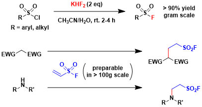 Sulfur(VI) fluoride compounds (e.g. RSO2F, SO2F2) are stable under a wide range of conditions, yet their S-F bonds can be activated for exchange reactions in the presence of proton or silicon reagents.