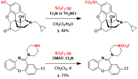 Gaseous SO2F2 and ROH react to form fluorosulfates. Since –OSO2F is a good leaving group, the application to functionalize phenols is common. Sulfamoyl fluorides are synthesized similarly from SO2F2 and secondary amines. The products formed from primary amines tend to be unstable due to the elimination of HF.